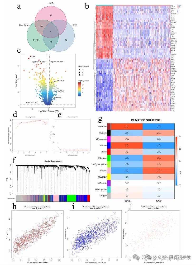 使用TCMSP数据库,从六个药物同源植物中鉴定出303个活性成分和453个药物靶标。从Genecards,Omim和TTD等公共数据库中获得了总共11,593个CRC靶基因)。 GSE41258数据集的差异表达分析鉴定了1672个差异表达的基因,我们使用热图和火山图对其进行了可视化。使用GSE41258数据集,通过加权基因共表达网络分析(WGCNA)构建基因共表达网络,以识别与CRC相关的关键基因模块。相似模块的整合产生了12个独特的基因簇,通过树状图可视化。其中,棕色,蓝色和粉红色模块与CRC/NonCRC表型表现出牢固的相关性。统计评估表明,这三个模块中与CRC相关基因之间的基因意义(GS)和模块构件(MM)指标之间存在强烈的正相关性。将三个模块的基因合并以获得WGCNA结果。通过交点计算,确定了49个潜在的治疗靶标。这些结果表明,这六种草药可以通过多个靶标的多个活性组件进行协同作用。