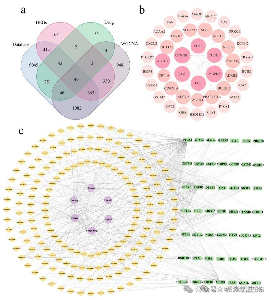 从海量数据中精准筛选:首先通过数据库挖掘,筛选出六种植物中的数百个活性成分,并预测出它们作用的数百个潜在靶点,构建了复杂的化合物-靶点网络。