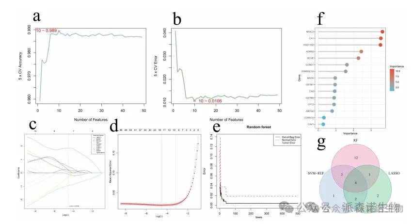 使用三种机器学习方法,我们筛选了49个相交基因,以评估其将CRC样品与GSE41258数据集中的对照区分开的能力,最终识别基因。 SVM-RFE算法鉴定了十个基因,其中包括CA1,Ca2,NR3C2,CES1,CCND1,CCND1,CXCL2,BCL2L1,HSD11B2,EIF6和ADIPOQ。通过拉索分析,将9个基因(ABCC1,BCHE,BCL2L1,CA1,CCND1,CES1,CXCL2,EIF6和P4HA1)做为核心靶基因。