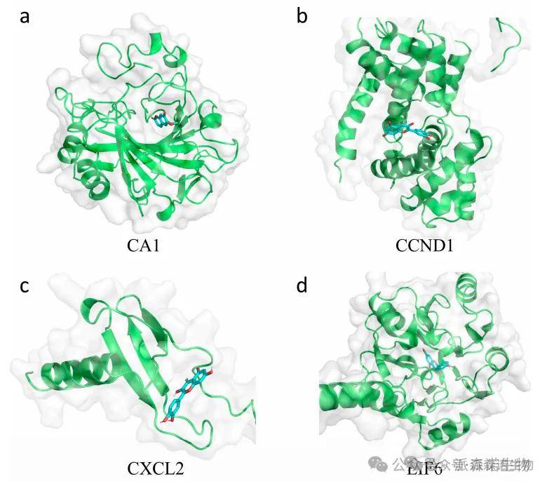 为了研究核心基因及其活性化合物之间的相互作用,我们进行了分子对接。低于-5 kcal/mol的结合能阈值用于确认结合亲和力。 CA1和CCND1结构对应于PDB文件1AZM和2W96,而CXCL2和EIF6结构是从Alphafold蛋白结构数据库中获得的。对接分析证实了所有核心靶蛋白及其配体之间的有利相互作用。我们说明了四种蛋白质的对接口袋以及提供了其相互作用的2D图。
