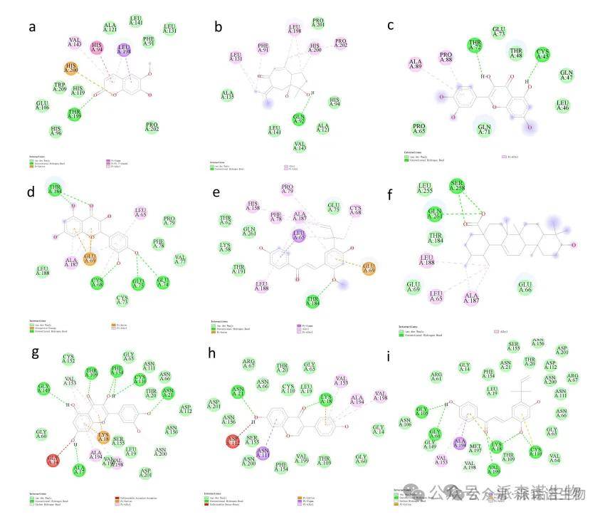 图7 目标核心蛋白及其相应配体分子的对接结果的相互作用图。
