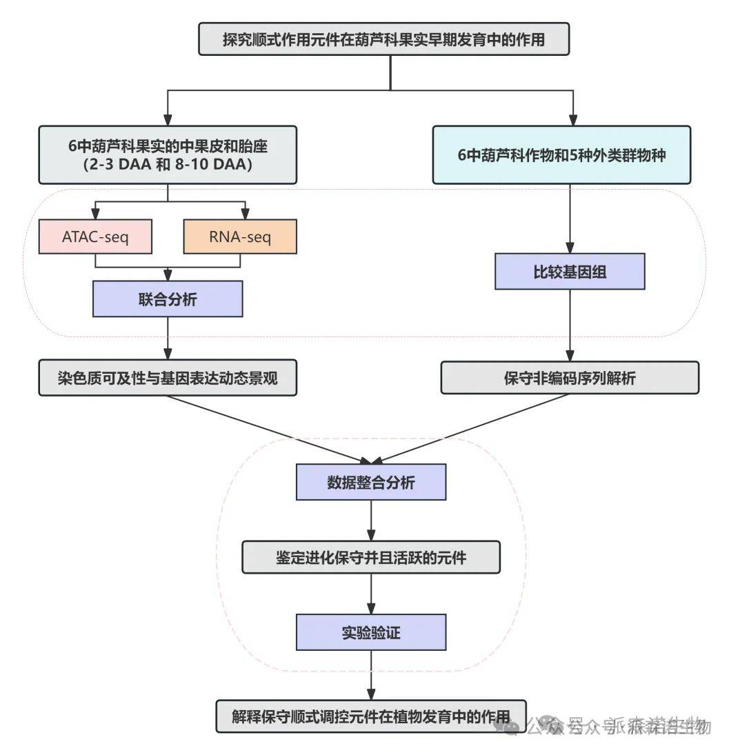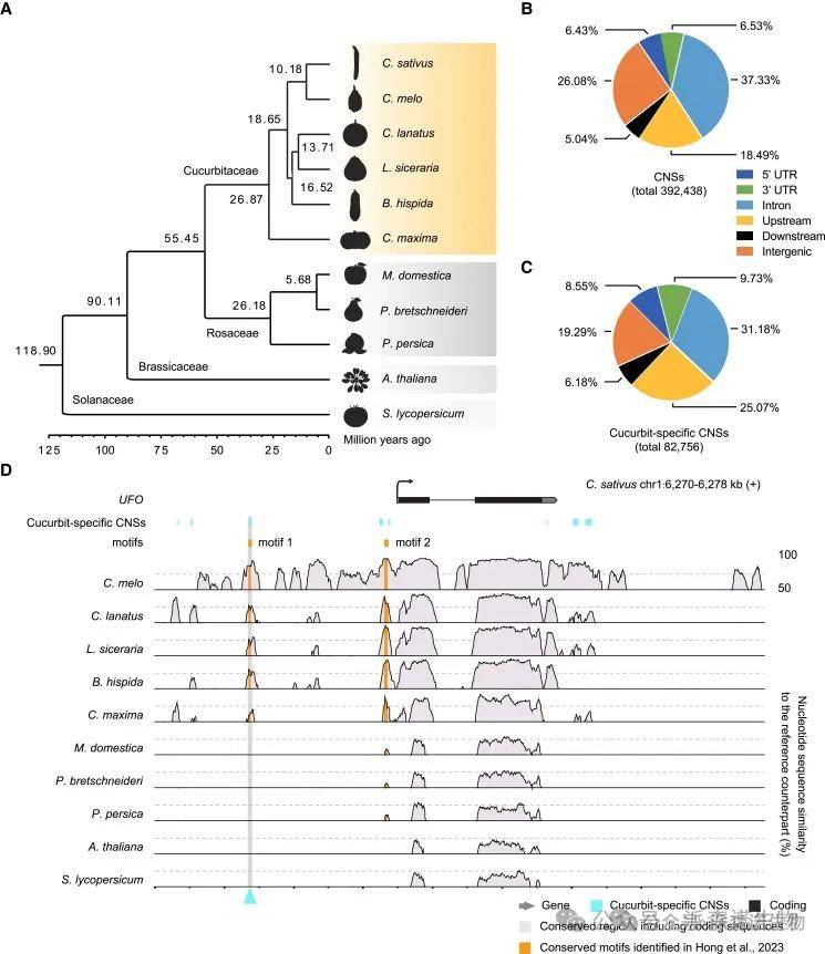 本研究探讨了保守顺式调控元件(CREs)在葫芦科作物早期果实发育中的作用及其进化历史。通过比较基因组学,鉴定出6种葫芦科作物和5种外类群物种中的392,438个保守非编码序列(CNSs),其中82,756个为葫芦科特有。