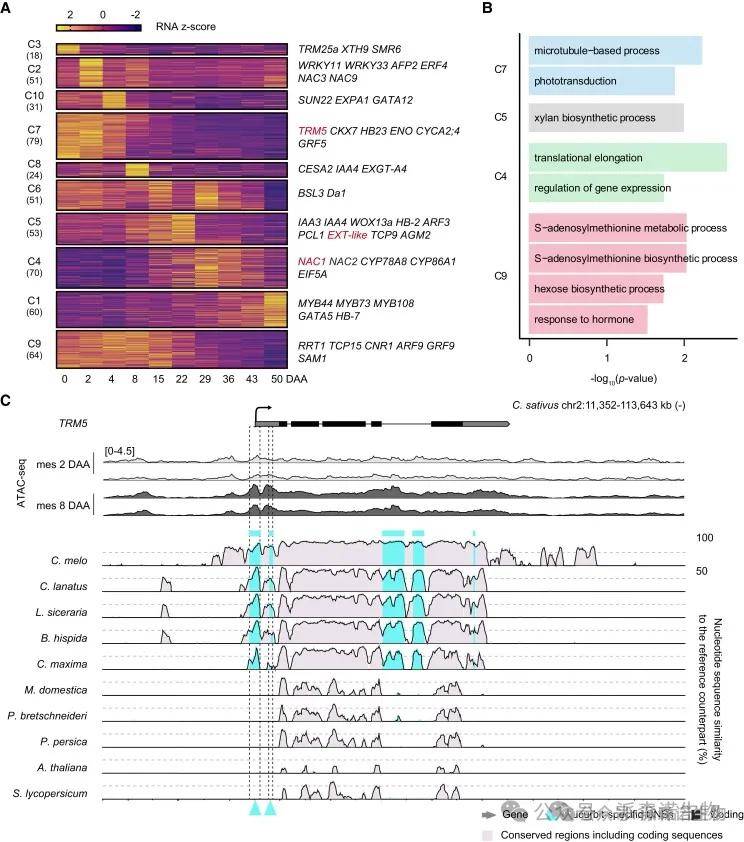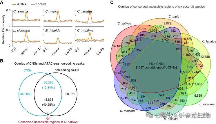 结合ATAC-seq和RNA-seq分析,定位了20,865至43,204个可及染色质区域(ACRs),这些区域与基因表达正相关,并表现出组织和阶段特异性。整合分析发现4,431个共线同源CNSs与ACRs重叠,其中1,687个为葫芦科特有,推测它们通过调控757个相邻基因参与早期果实发育。