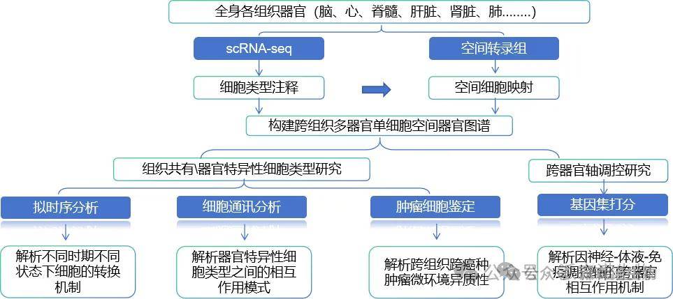 针对不同组织样本(全身组织器官、重要组织器官),进行单细胞转录组测序,配合空间转录组测序从而实现以下研究目标: