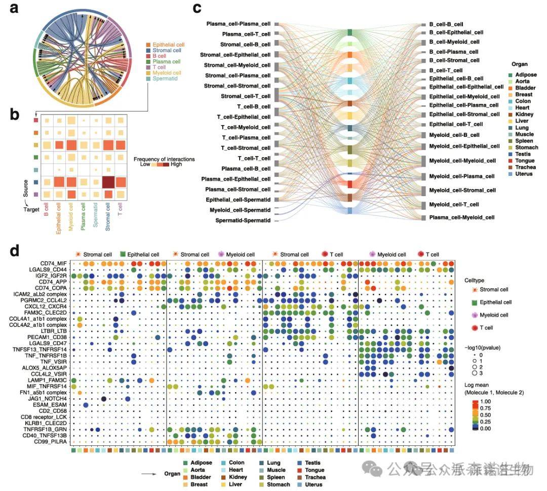 针对跨器官共有细胞类型,通过配体 - 受体互作分析(如 CellChat 算法),对比其在不同器官中的通讯强度、信号通路重叠度,挖掘跨组织保守的细胞互作模块;对器官特异性细胞类型,解析其独有的配体 - 受体对及上下游调控网络,结合功能富集,揭示器官微环境驱动细胞通讯特化的分子机制。