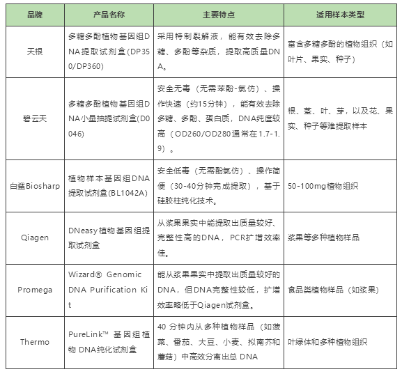 样本类型:不同植物组织(如叶片、种子、果实)以及它们是否富含多糖、多酚等次生代谢物,是首要考虑因素。对于特殊样本,应选择针对性强的试剂盒(如天根DP350或碧云天D0046用于多糖多酚样本)。