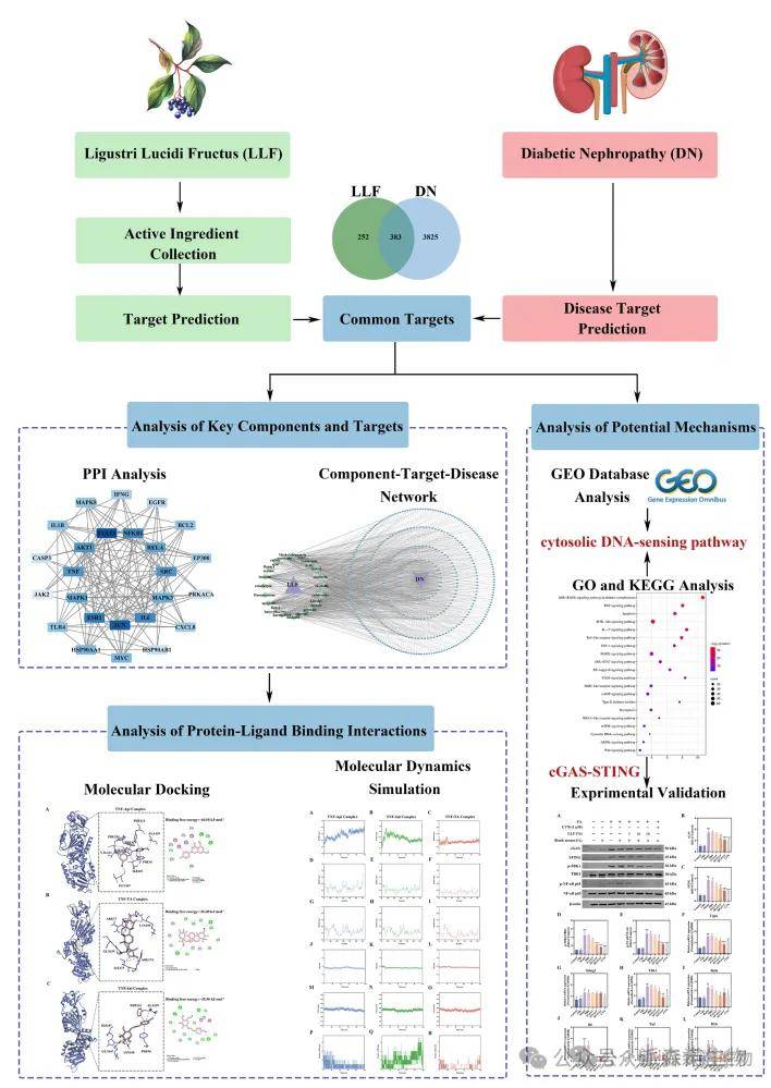传统单一靶点研究模式难以解析中药多成分、多靶点的复杂作用机制。网络药理学与分子动力学模拟等现代计算方法为此提供了理想工具,但需最终通过生物实验进行验证。面对糖尿病肾病治疗的巨大未满足需求,本研究旨在利用整合计算与实验的现代策略,科学阐释传统中药女贞子的治疗潜力与作用机制。
