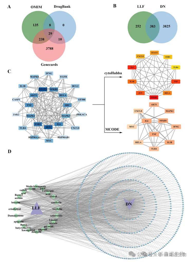 通过将来自OMIM,药品库和GeneCards数据库的数据组合在一起,总共获得了4208个与DN相关的目标(图2A)。通过相交分析,确定了383个重叠靶标,将它们牵涉到LLF在DN中的治疗作用中(图2B)。