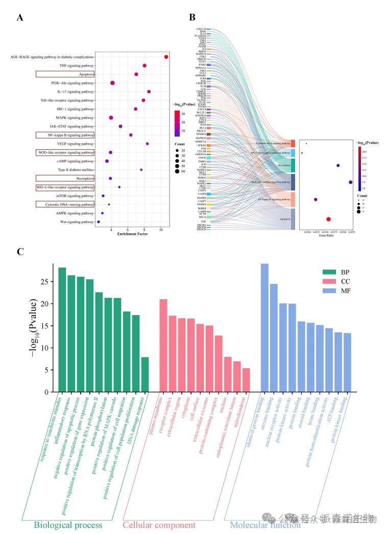 通过对383个重叠目标的功能分析,总共确定了186个重要途径(P值<0.05)。选择了由P值排名的前20个与DN相关的途径进行可视化(表S3,图3A)。其中,凋亡,NF-κB信号,点头样受体信号,坏死性和类似I的受体信号通路都与kegg数据库中的胞质DNA传感途径(KEGG输入:MAP04623)有关(图S2)。生成了Sankey图来说明这六个途径及其相关目标之间的相互作用(图3B)。