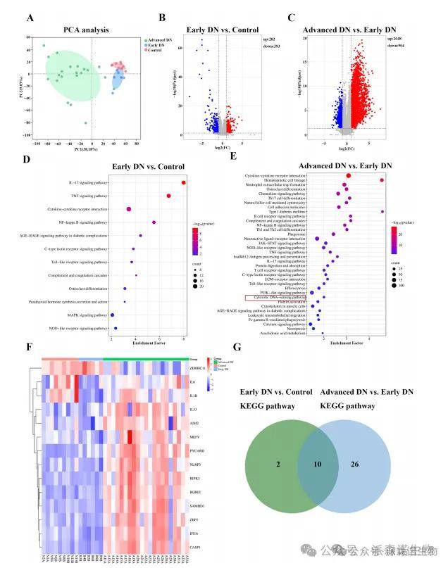 DEG的KEGG途径富集分析揭示了早期DN与对照中的12个DN相关途径(图4D),包括IL-17,TNF,NF-κB和年龄段信号通路。晚期DN与早期DN比较确定了36个相关途径(图4E),包括细胞因子-循环受体相互作用,破骨细胞分化和细胞质DNA传感途径。
