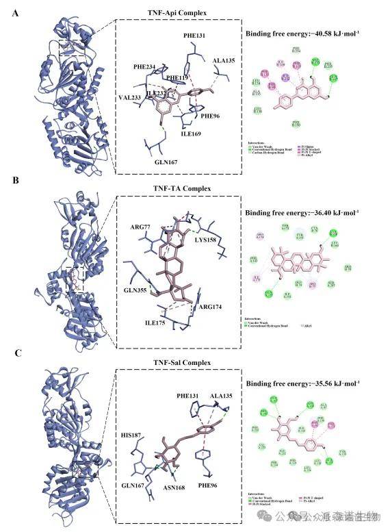 TNF-API,TNF-TA和TNF-SAL配合物的计算结合自由能分别为-40.58,-36.40和-35.56 kJ·mol-1。这些计算结果表明TNF和API,TA和SAL之间的潜在相互作用。使用Discovery Studio 2019可视化预测的结合模式(图5)。