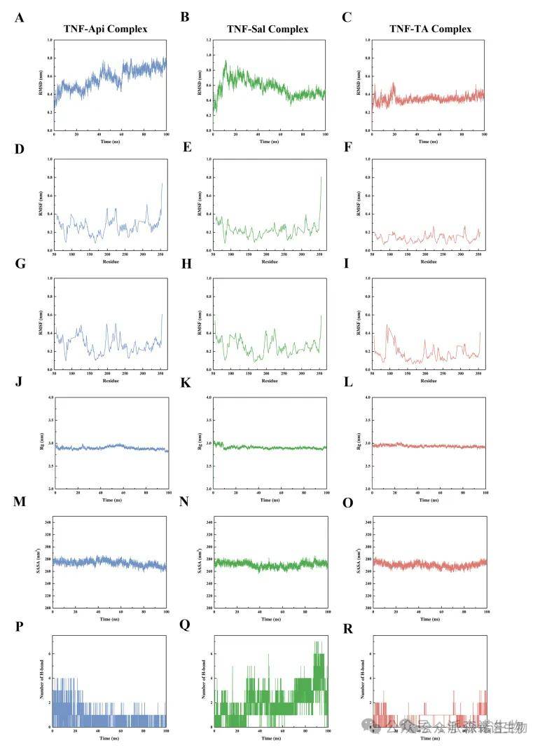 使用分子动力学模拟来探索配体 - 受体复合物的结构动力学。分析的三个系统是TNF-API,TNF-SAL和TNF-TA复合物。