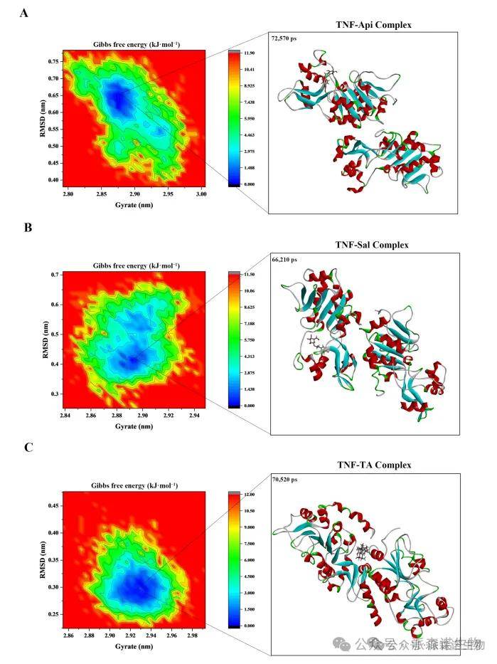 图6 TNF和API,TA和SAL之间的分子结构和结合位点的分子动力学模拟。