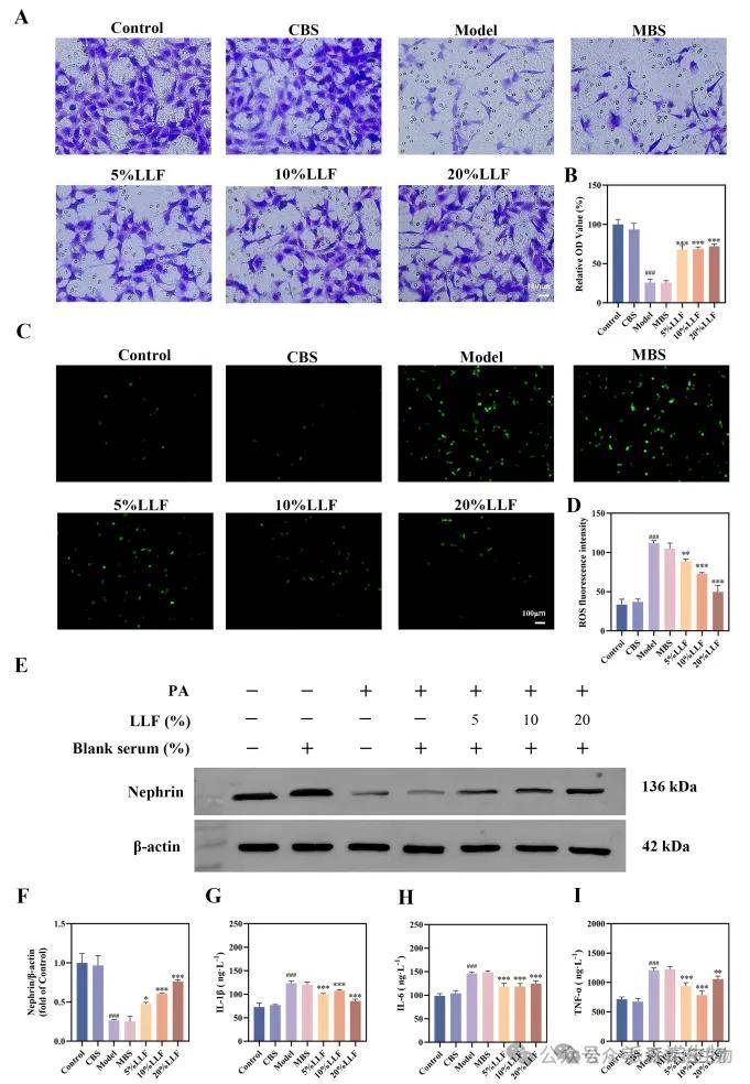炎性细胞因子释放有助于阳性反馈循环加剧足细胞损伤。使用ELISA,显示各种含LLF的血清可显着抑制PA诱导的IL-6,TNF-α和IL-1β释放(图8G – I)。