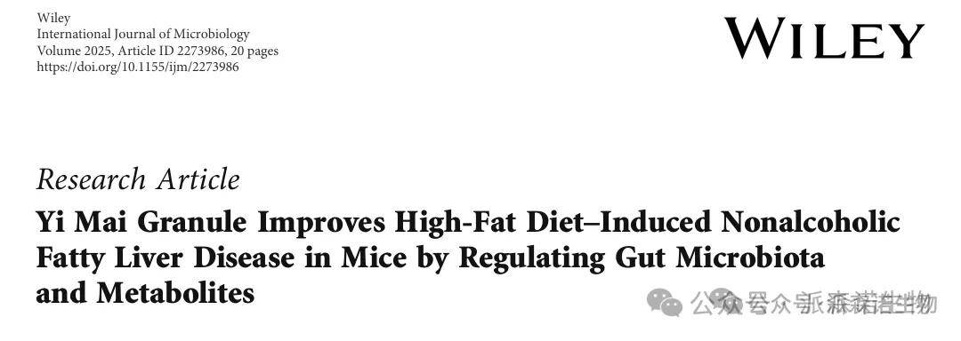 Pang L, Liu Y, Yuan C, Ju Y, Wu J, Cheng M, Jin S, Fan Y, Zhang H, Wang Y, Min D. Yi Mai Granule Improves High-Fat Diet-Induced Nonalcoholic Fatty Liver Disease in Mice by Regulating Gut Microbiota and Metabolites. Int J Microbiol. 2025 Mar 23;2025:2273986. doi: 10.1155/ijm/2273986. PMID: 40166691; PMCID: PMC11955292.