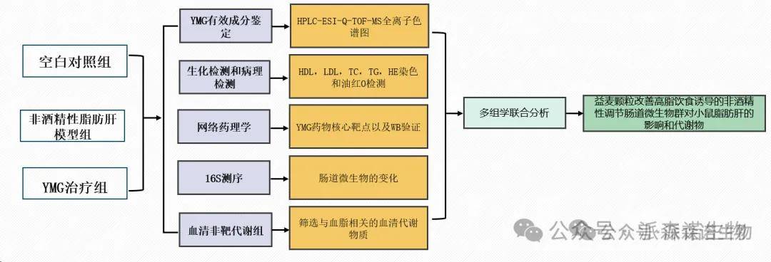 目前,临床上缺乏批准用于治疗NAFLD/NASH的特效药物。标准治疗方案主要依赖于生活方式干预,如减肥和饮食控制,但患者依从性往往较差。因此,开发新的有效药物是当前医学研究的迫切需求。近年来,越来越多的证据表明,肠道与肝脏之间通过门静脉紧密相连,存在双向对话,即 “肠-肝轴”。肠道菌群失调被认为是NAFLD发生发展的关键因素之一。增加肠道通透性,导致细菌内毒素(如LPS)进入门静脉循环。有害代谢物增多:产生更多的有害物质(如内毒素、吲哚等)。短链脂肪酸(SCFAs)、胆汁酸等有益代谢物的产生和代谢发生紊乱。这些变化会触发肝脏的炎症反应、胰岛素抵抗和脂质代谢紊乱,从而驱动NAFLD的进展。因此,调节肠道菌群已成为治疗NAFLD的一个极具潜力的新策略。中药复方具有“多成分、多靶点、整体调节”的特点,这与通过调节肠道微生态这一复杂系统来治疗复杂性疾病(如NAFLD)的理念高度契合。益脉颗粒的既往证据:益脉颗粒(Yi Mai Granule)是一个中药复方,可能基于前期临床观察或研究,显示出对心脑血管或代谢性疾病的潜在益处(从其名称“益脉”可推断其可能与活血、通脉有关)。尽管可能有效,但益脉颗粒是否对NAFLD有治疗作用,特别是其作用机制是否与当前前沿的“肠-肝轴”理论有关,是完全未知的。其如何影响肠道菌群结构及其功能(代谢物),又如何将这些变化与肝脏改善联系起来,是本研究旨在解决的核心科学问题。