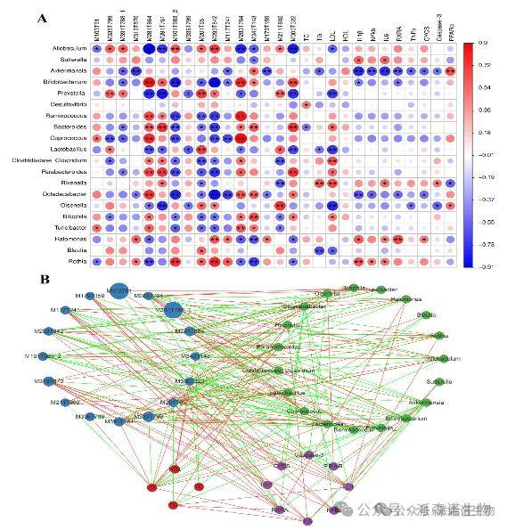 构建Spearman相关热图,并进行相关网络分析,探讨YMG调节肠道微生物群和代谢产物改善NAFLD的机制。热图(图8A)显示了血脂指标与前20种不同的肠道微生物群、代谢物和核心蛋白之间的相关性。相关网络分析显示,血脂指标、肠道微生物群和代谢物之间存在差异。这表明,前20种不同的肠道微生物群对代谢物、核心蛋白和血脂指标具有不同的调节作用。