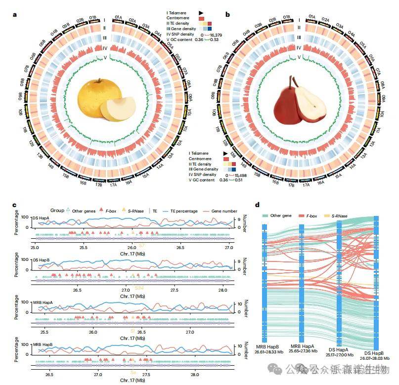 研究人员基于高杂合度的“砀山酥梨”(DS,1.23%)和西洋梨(MRB,1.33%),整合PacBio HiFi、ONT超长读长和Hi-C数据,利用hifiasm初步组装出二倍体单倍型,再通过Verkko和HiCanu填补缺口与端粒区域。所有填补区域均获ONT和HiFi读长均匀覆盖支持。最终每个单倍型均被组装为17条对应染色体的contig,基因组大小在497.50–505.55 Mb之间,contig N50 ≥ 28.96 Mb。相比已发表基因组中18.89–24.13 Mb未组装区域,本次组装在contig N50、比对率、BUSCO评分及LTR组装指数等方面均表现优异。通过端粒重复序列鉴定,DS和MRB分别检出34和33个端粒(图1a–b),标志着DS与MRB的T2T单倍型基因组已完成。