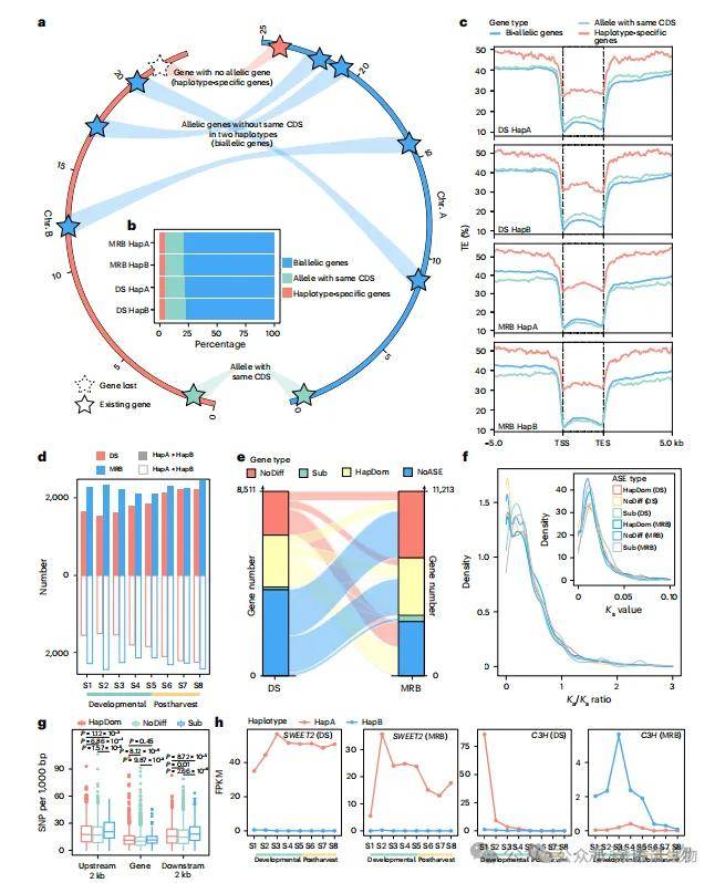 在DS和MRB八个果实发育阶段中,分别有19.64和26.21%的基因呈现等位基因特异性表达(ASE)(图2d)。ASE基因可分为三类:HapDom、新功能化配对等位基因,以及其他类型(图2e)。木质素合成关键基因Pbre1_15G769200(C3H)和Pbre1_13G264800(4CL)在果实早期(S1–S2)表达均显著高于另一单倍型中的等位基因(图2h)。