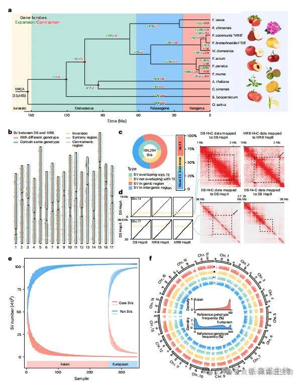 基于362份梨种质的重测序数据,进一步对比到图谱基因组进行SV基因型鉴定,最终保留83,369个高质量SV位点(等位基因频率>0.05,缺失率<0.2)。以DS HapA为参考时,76.82%的SV在亚洲梨中出现频率超过0.5,而在欧洲梨中仅为42.73%(图3f)。共有35,481个SV在两类群体间呈现显著频率差异(FDR<<0.001,倍数变化>2)。