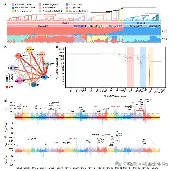 图4|不同梨类群体的系统发育关系、种群历史和选择性清除。