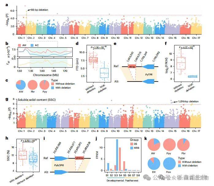 本研究利用83,369个高质量SV,首次通过SV-GWAS揭示了与梨果实性状相关的结构变异。分析发现,第2号染色体上一个66 bp缺失与果实横径(FTD)显著相关(图5a)。该缺失位于AC梨的选择清除区内(图5b),在Ppy和Pbr中出现频率低于AW类群(图5c),且非缺失型品种的FTD显著更高(图5d)。其下游基因Py TPR编码一种四肽重复蛋白,已知参与植物发育及细胞伸长过程。该基因在非缺失型资源中表达水平显著更高(图5f),表明Py TPR可能在亚洲梨驯化中被选择,并影响果实发育与风味积累。