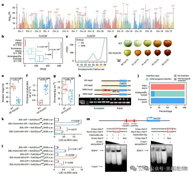 结构变异(SV)可能通过干扰调控区或基因区域影响基因表达。基于110份梨样本(62亚洲梨、38欧洲梨)的RNA-seq数据,研究发现上游2 kb区域的4,040个SV和外显子区的568个SV与基因表达显著相关(图6a);其中分别有70.79%和65.49%的SV在亚欧群体间频率差异显著(FDR<<0.001,FC>2),表明SV可能调控群体间基因表达。与亚洲梨不同,呼吸跃变型的欧洲梨依赖乙烯启动成熟和软化。研究鉴定出5个携带SV的乙烯合成相关基因,包括编码限速酶ACS的PyACS1(Pbre1_15G535800)。该基因在欧洲梨中表达显著高于亚洲梨(图6b),种间杂交后代表达更高,提示超显性表达。PyACS1在MRB果实后期(S4–S5)和采后(S6–S8)高表达,在DS各阶段均低表达(FPKM<0.1;图6c)。过表达PyACS1的番茄果实成熟更快(图6d,e)、乙烯释放增多(图6f)、硬度下降(图6g),证实其促进成熟与软化。
