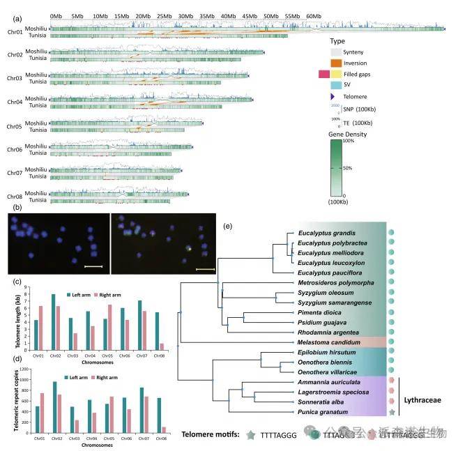 图1|无间隙基因组组装“Moshiliu”的全基因组景观及石榴中不寻常端粒基序的分析
