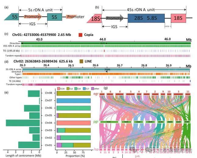 rDNA分析显示,石榴中5S rRNA由5S rDNA编码(图2a),18S、5.8S和28S rRNA来自45S转录本剪接(图2b)。FISH结果证实,染色体1和2上分别存在一个2.65 Mb的45S rDNA阵列(含约835个单元)和一个625.6 kb的5S rDNA阵列(含约2006个单元)(图2c–d)。两个阵列中分别检出195.8 kb和14.4 kb的转座元件。约33%的卫星重复定位于着丝粒,CL2和CL6为主要成分,占着丝粒区域70.7%(图2e)。根据其比例,可将着丝粒分为三类结构,部分染色体(如1、2、5等)的着丝粒几乎全部由CL2和CL6覆盖,而7号和4号染色体则分别主要由CL7和CL16构成(图2e)。