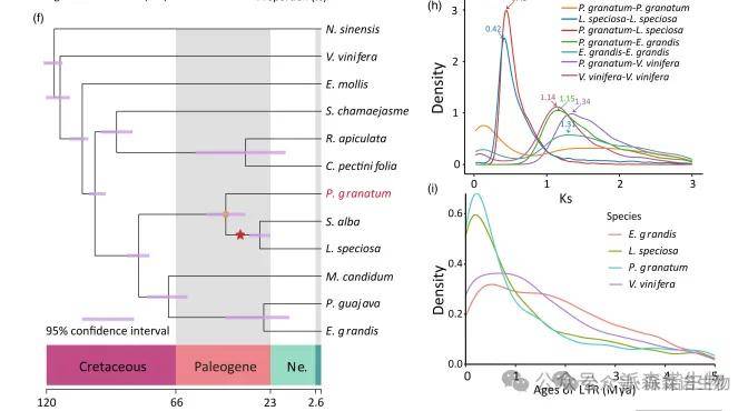 全基因组复制(WGD)事件在被子植物进化中具有重要作用。系统发育分析表明,石榴与白百合、斑叶百合等百合科物种的共同祖先,约在8378万年前与茄科、桃金娘科物种分化(图2f)。斑叶百合在分化后不久发生了全基因组三倍化事件(图2g, h),而石榴自身未检测到明显的近期WGD事件,该结论得到了4DTv分析(图S8)和共线性评估(图S9)的进一步支持。此外,长末端重复逆转录转座子(LTR-RTs)的插入时间分布也验证了这一进化时间线(图2i)。