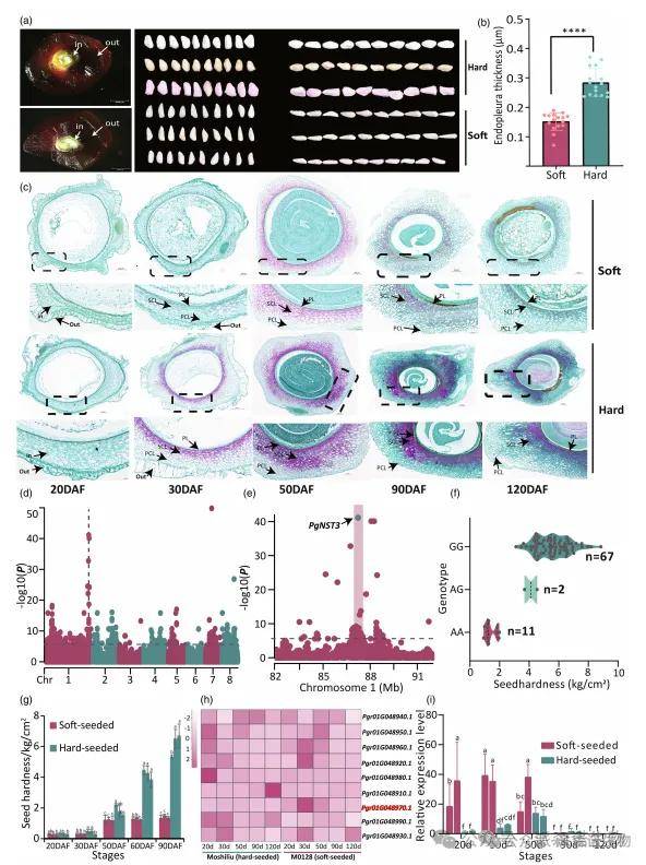 遗传分析表明,软籽性状可能受单一隐性基因控制。GWAS在1号染色体上定位到一个与硬度相关的主效基因座(图5d)。其领先SNP位于基因Pgr01G048970内,该基因编码一个NAC结构域蛋白,与拟南芥中调控次生细胞壁增厚的AtNST3同源,故命名为PgNST3。一个关键的非同义突变(G→A)导致其DNA结合域发生E56K氨基酸替换,分别形成硬籽等位基因PgNST3G和软籽等位基因PgNST3A(图5e, 图S17)。对80个品种的测序验证显示,该SNP与表型完全共分离(图5f)。
