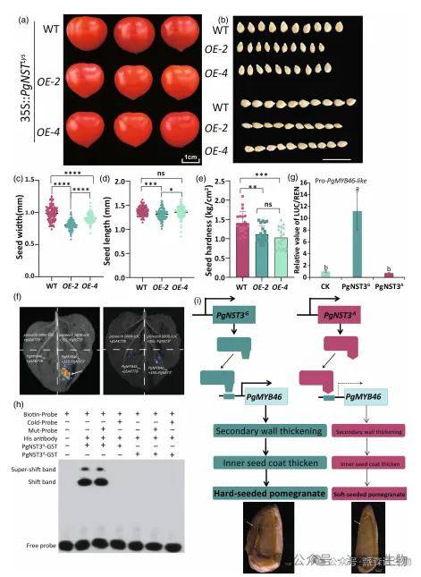 为验证PgNST3等位基因功能,我们在番茄中过表达了PgNST3G和PgNST3A。结果显示,过表达PgNST3A可导致种子种皮变薄、硬度显著降低(图6a-d),而过表达PgNST3G无显著表型(图S20)。分子机制研究表明,PgNST3G能直接结合并激活下游靶基因PgMYB46的启动子(图6f-h),而因关键SNP(G→A)产生的PgNST3A蛋白则丧失了此结合能力(图6h)。结论表明,该非同义突变通过削弱PgNST3A对PgMYB46的转录激活,最终导致软籽石榴内种皮变薄(图6i)。