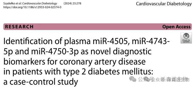 本研究使用微阵列技术揭示了患有共病 CAD 的 T2DM 患者血浆 miRNA 的独特特征。综合生物信息学分析表明,DE-miRNA靶基因主要富集在细胞过程调控、基因表达、脂肪酸代谢、氧化应激反应、神经营养因子信号通路和白细胞跨内皮迁移相关的通路中,已知参与糖尿病动脉粥样硬化的发生。我们独立证实,与T2DM受试者相比,has-miR-4505和has-miR-4743-5p在T2DM-CAD患者中显著过表达,而has-miR-4750-3p在T2DM-CAD患者中下调,可能作为糖尿病加速CAD的新型非侵入性分子标志物。我们创新性地开发了一种基于has-miR-4505、has-miR-4743-5p、has-miR-4750-3p联合表达的三miRNA模型,可以有效检测白种人群T2DM中的CAD。