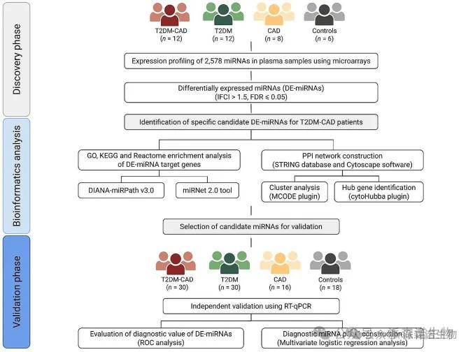 步骤1:收集了来自患有和不患有 CAD 的 T2DM 患者、CAD 患者和健康对照的 38 份血浆样本,用于miRNA 表达谱分析。