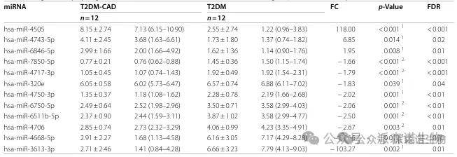 得到了 18 个 DE-miRNA ,其中 3 个在 T2DM-CAD 组和 T2DM 组之间上调,15 个下调。在T2DM-CAD患者和对照组之间总共发现了35个DE-miRNA。此外,在 T2DM 个体和健康对照之间鉴定出 5 个 DE-miRNA,而在 T2DM-CAD 组和 CAD 组之间检测到 4 个 DE-miRNA。最后,这些DE-miRNA组的比较允许提取12个仅适用于患有CAD的T2DM患者的DE-miRNA。