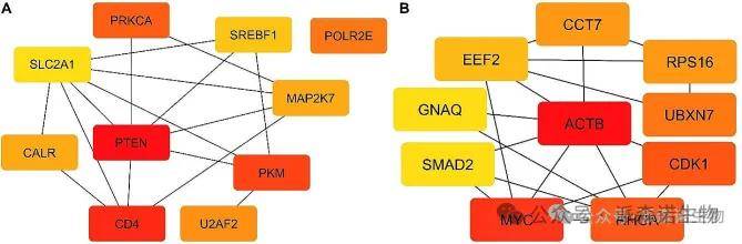 图5 DE-miRNA靶基因PPI网络中排名前10的枢纽基因