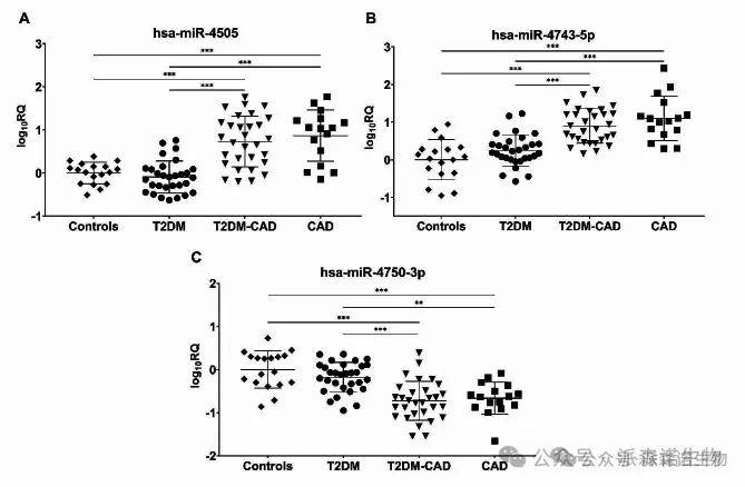 与研究的发现阶段类似,发现has-miR-4505和has-miR-4743-5p显著上调,而has-miR-4750-3p在T2DM-CAD组中与T2DM组相比下调,T2DM-CAD组与对照组相比均下调。与 T2DM 个体相比,has-miR-4505 中检测到 miRNA 表达增加最多,变化了 6.64 倍,has-miR-4750-3p 的表达水平降低了 3.50 倍。