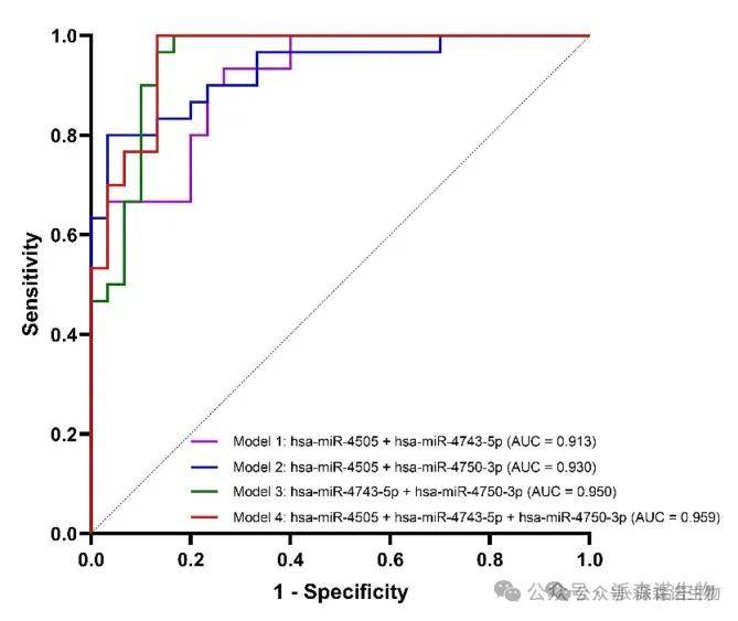 为了研究分类能力最强的miRNA组合对T2DM-CAD和T2DM受试者的区分,建立了logistic回归模型。根据研究验证阶段获得的miRNA表达水平结果,推导出了4个模型:模型1以has-miR-4505和has-miR-4743-5p的表达为自变量,模型2包括has-miR-4505和has-miR-4750-3p,模型3基于has-miR-4743-5p和has-miR-4750-3p的表达,而模型4则包括所有三个变量。数据表明,由has-miR-4505、has-miR-4743-5p和has-miR-4750-3p组成的3-miRNA组合在检测T2DM中CAD的最佳分类准确度。