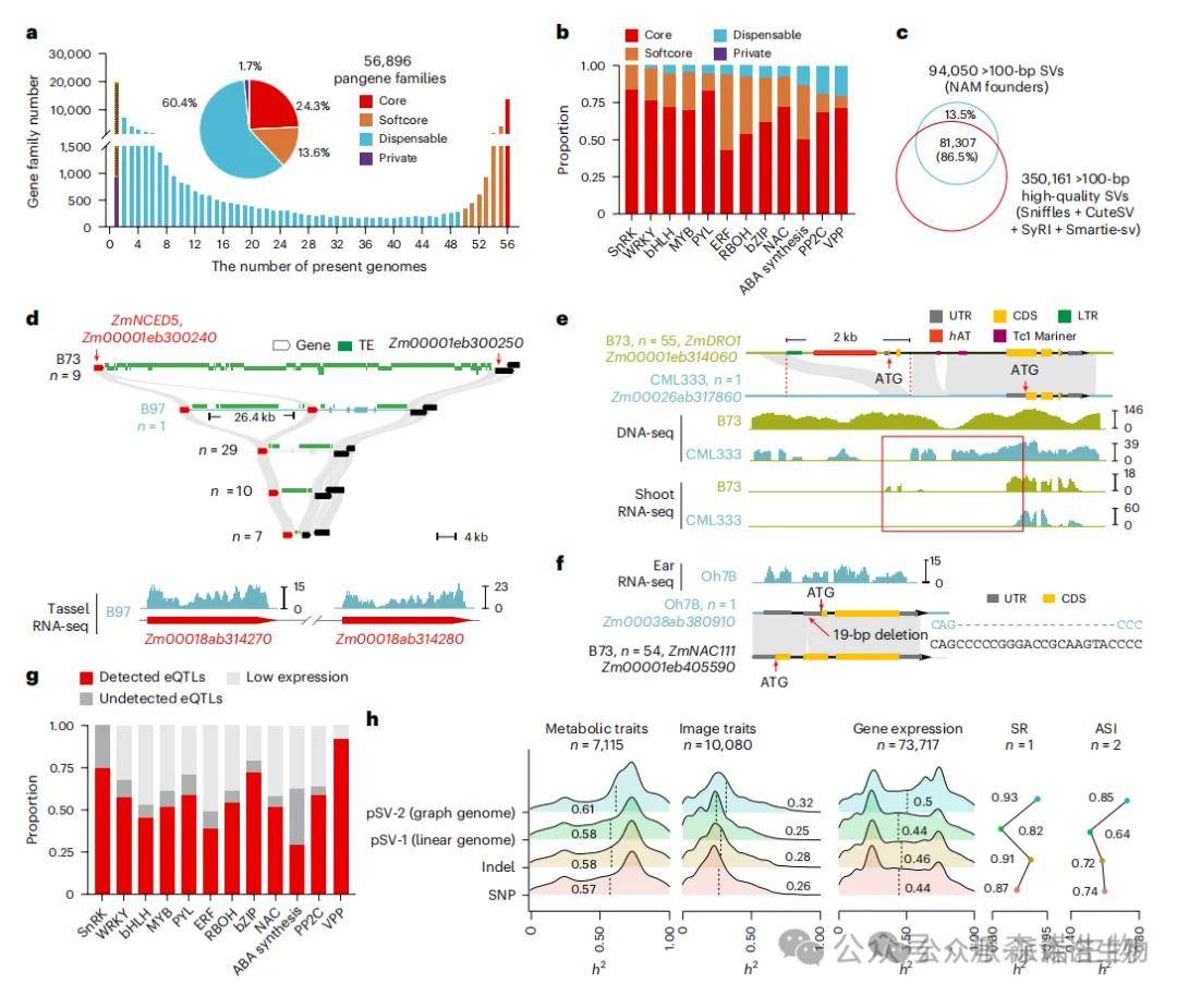 基于整合56个玉米种质构建的高质量泛基因组,本研究在基因和结构变异(SV)层面取得了系统性发现。首先,泛基因组分析显示,尽管经典的ABA或干旱响应基因在种质间高度保守(92.4%属于核心、软核心家族),但通过大规模SV鉴定(近300万个非冗余SV),仍在这些保守基因中发现了存在于特定抗旱或敏感种质中的稀有功能等位变异(如ZmNCED5重复、ZmDRO1缺失等),这些变异是传统SNP分析难以捕捉的。进一步通过构建图基因组优化SV分型后进行群体水平分析表明,SV能显著影响大量抗旱相关基因的表达(eQTL),且基于图基因组的SV数据集(pSV-2)对多种抗旱相关性状遗传力的解释力显著优于SNP和传统方法鉴定的SV。这共同证明,结构变异是驱动玉米抗旱性多样性的关键遗传基础,凸显了基因组结合图泛基因组分析在解析复杂性状中的核心价值。