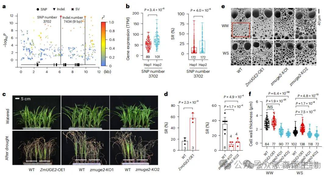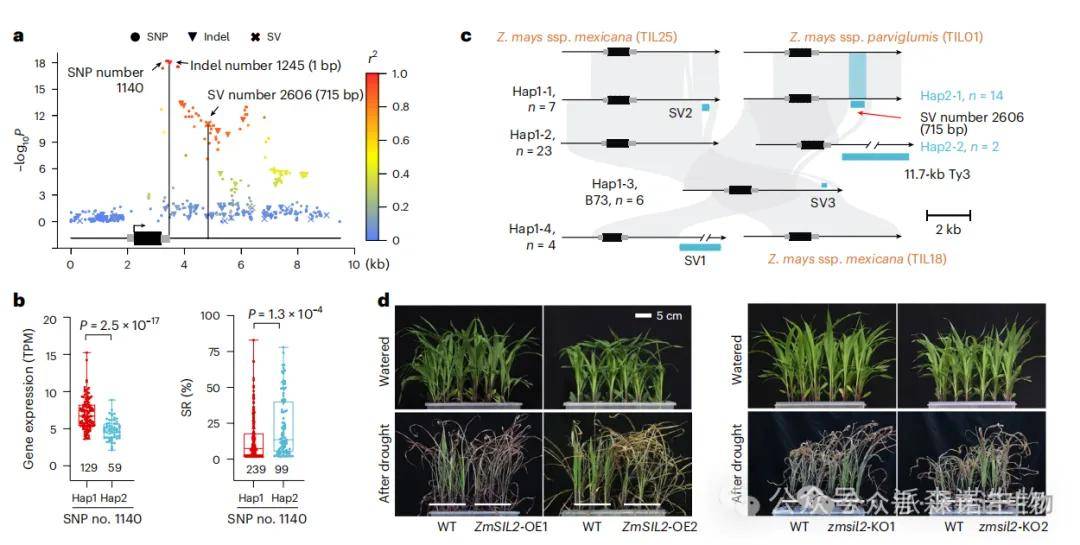 通过GWAS、单倍型分析和转基因功能验证,研究人员揭示了两个在玉米苗期抗旱发挥关键作用的基因。ZmUGE2为正向调控因子,编码UDP-葡萄糖4-差向异构酶,可能参与细胞壁代谢,过表达ZmUGE2的转基因玉米(ZmUGE2-OE)比野生型(WT)表现出更强的抗旱性,而利用CRISPR-Cas9技术敲除该基因的株系(Zmuge2-KO)则对干旱更敏感;ZmSIL2为负向调控因子,编码一个定位于细胞核的三螺旋转录因子,作为转录抑制子,通过直接结合靶基因启动子区的“CGCCGCCGC” motif,负向调控一系列胁迫响应基因的表达,敲除该基因反而能增强抗旱性,其3‘-UTR区域存在的结构变异(SV),特别是转座子插入,与不同的单倍型和抗旱表型相关,且这些变异在玉米祖先类蜀黍中已存在。