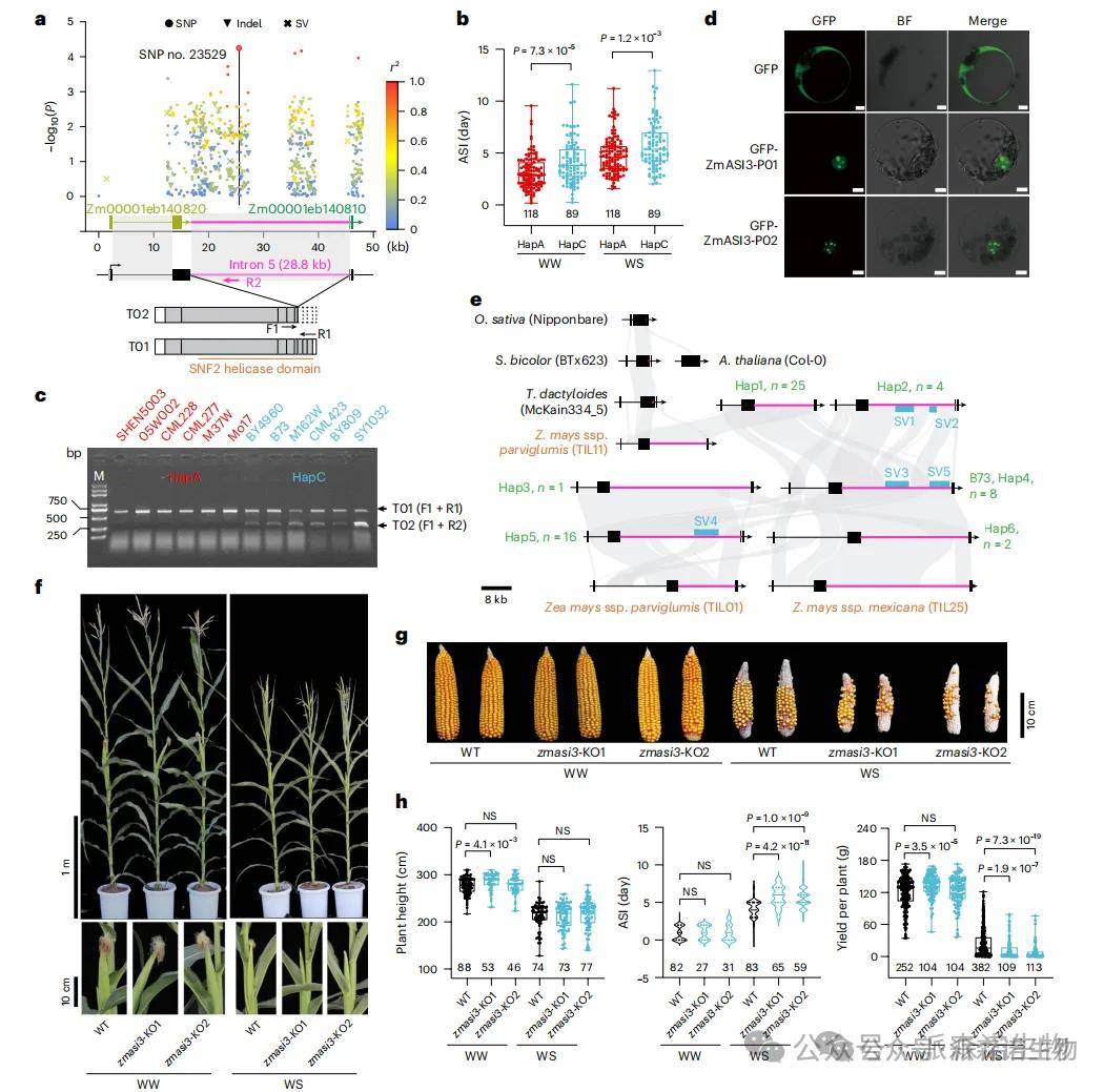 基于GWAS分析,研究人员在3号染色体上鉴定到一个与ASI显著相关的区域。该区域在B73参考基因组中被错误注释为两个独立的基因,实际上是一个因巨大内含子5(28.8 kb,富含转座子)而被错误分割的单一基因,将其命名为ZmASI3。根据SNP特征,研究人员划分出HapA(ASI小,抗旱)和HapC(ASI大,敏感)两种主要单倍型。在干旱胁迫下,HapC单倍型由于内含子5的异常剪接,产生两种转录本:功能正常的全长蛋白(P01)和因保留内含子导致翻译提前终止的无功能截短蛋白(P02)。功能实验证实,只有全长P01蛋白具有ATP酶活性和染色质重塑活性。CRISPR-Cas9敲除实验证实,ZmASI3功能的丧失会显著延长ASI并增加产量损失,证明该基因对开花期抗旱性具有正向调控作用。