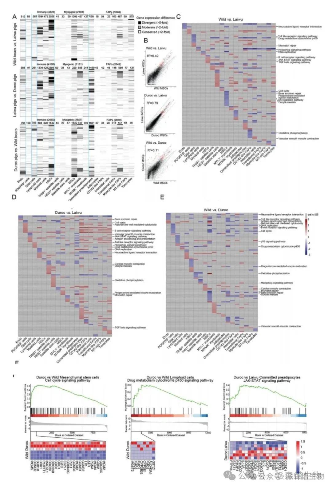 图1. 野猪、莱芜猪和杜洛克猪骨骼肌来源细胞类型的基因表达模式差异较大[1]