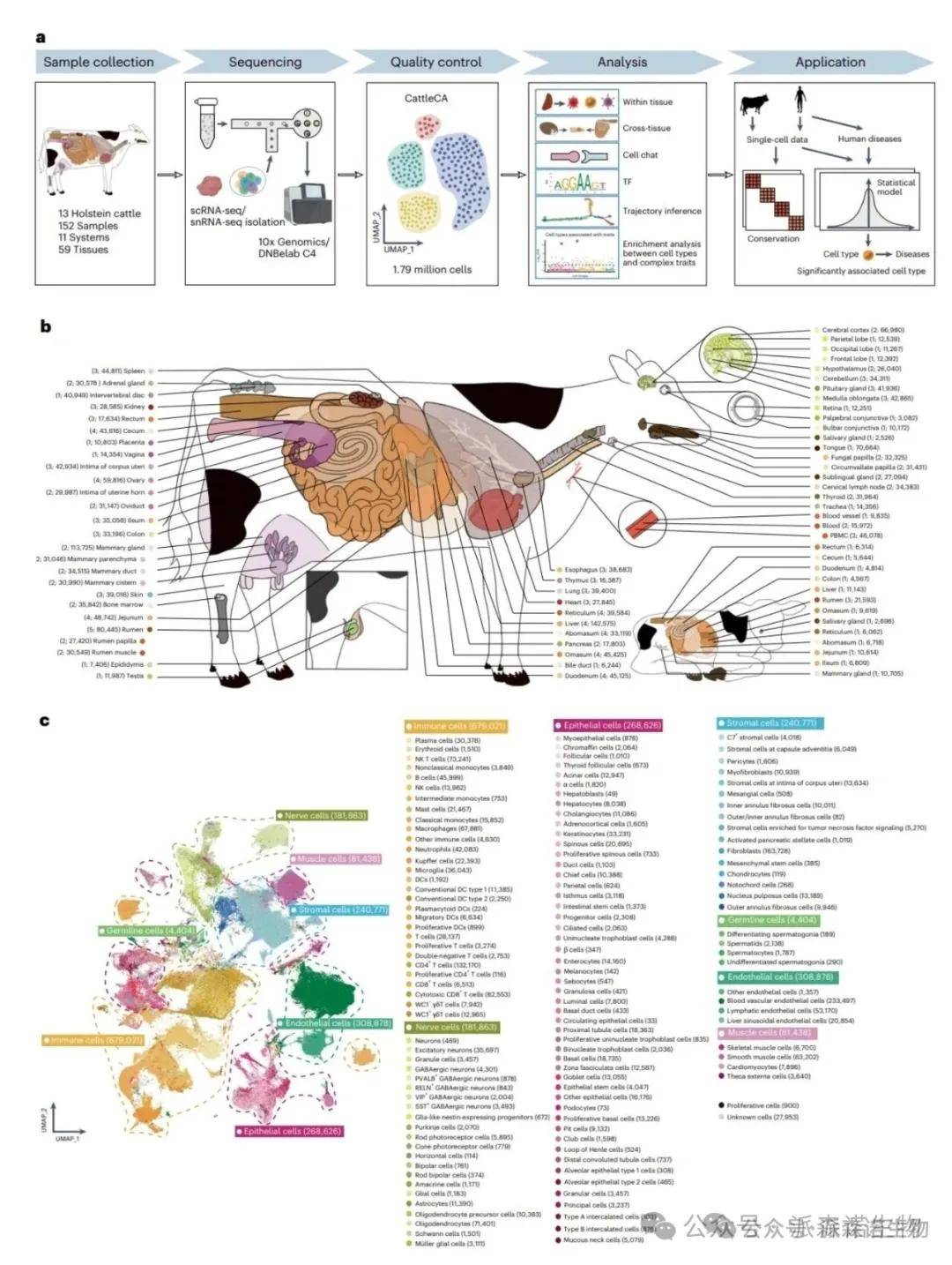 图5. 59种牛组织的单细胞转录图谱[5]
