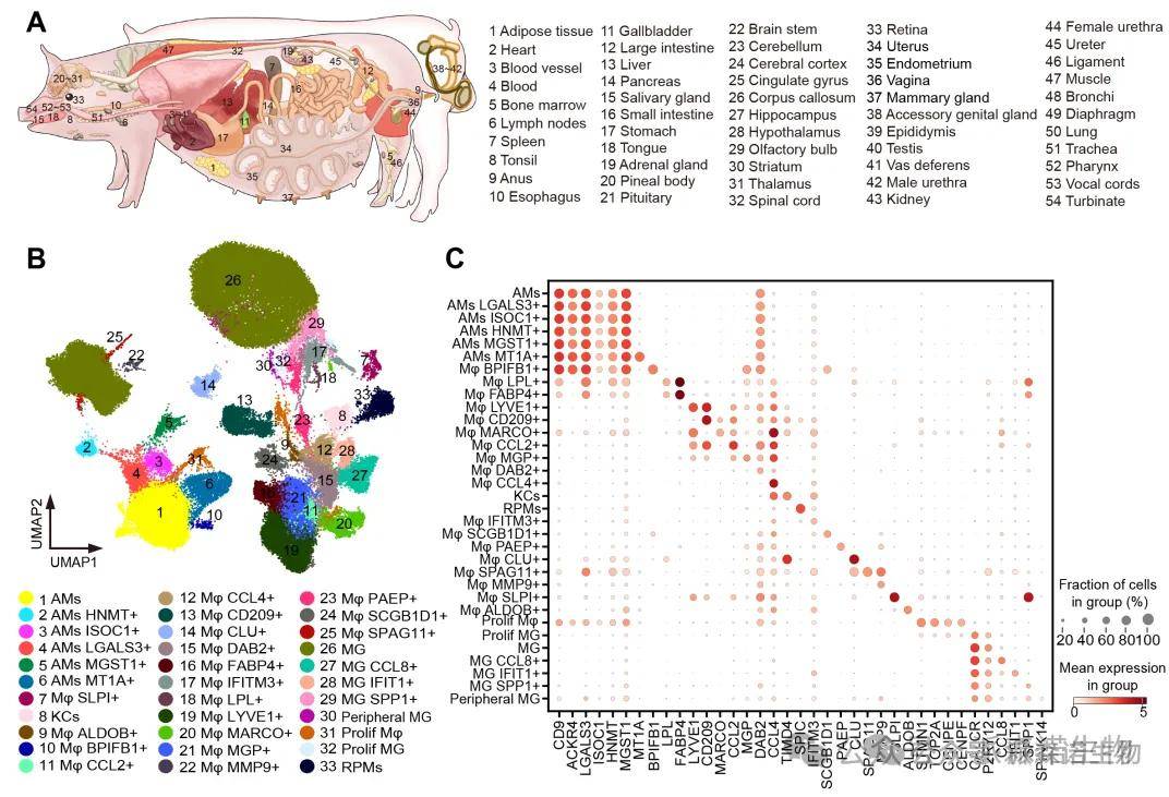 图6. 单个猪体内的 49 块组织进行单细胞转录组分析[6]