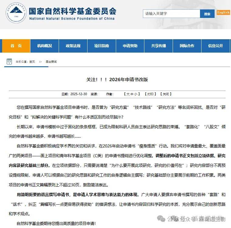 2025年12月30日,国家自然科学基金委员会发布重要通知,宣布将于2026年对项目申请书进行改版。本次改版以“瘦身提质”为核心,重点对申请量最大、覆盖面最广的两类项目—面上项目与青年科学基金项目(C类)的申请书提纲进行优化调整,旨在着力解决当前申请书中存在的“套路化”写作倾向及篇幅冗长等问题,引导科研人员更聚焦于科学问题本身,提升申请材料的质量与评审效率。