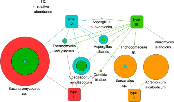 随着堆肥进程,真菌群落分为四个阶段。早期堆肥阶段(Type I)主要为Saccharomycetales sp.;中期堆肥阶段的真菌群落包括Type II型和III型,主要为Sordariales sp.,Acremonium alcalophilum,Saccharomycetales sp.和Scedosporium minutisporum;后期堆肥阶段(Type IV),主要为Scedosporium minutisporum,且极易受深度影响。
