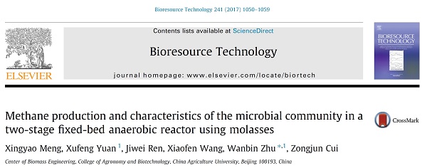 Meng X, Yuan X, Ren J, et al. Methane production and characteristics of the microbialcommunity in a two-stage fixed-bed anaerobic reactor using molasses.[J]. BioresourceTechnology, 2017, 241.doi: 10.1016/j.biortech.2017.05.181