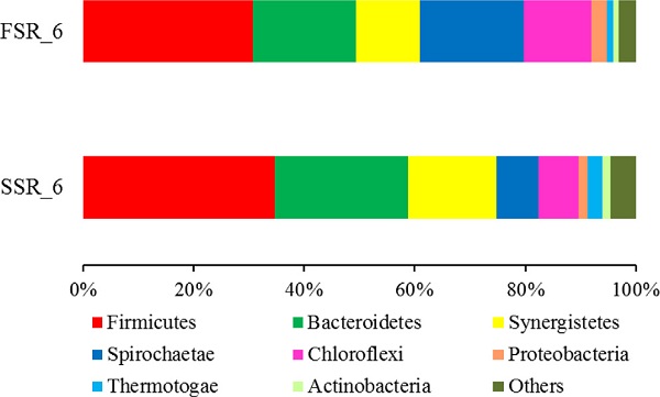 由门和科水平的物种组成可知,第一阶段(FSR)Anaerolineaceae等相对丰度较高,能够消化碳水化合物,第二阶段(SSR)Synergistaceae等相对丰度较高,能够消化VFAs和难分解化合物,且降解产物供产甲烷菌利用。
