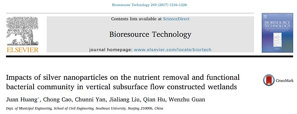 Huang J, Cao C, Yan C, et al. Impacts of silver nanoparticles on the nutrient removal and functional bacterial community in vertical subsurface flow constructed wetlands[J]. Bioresource Technology, 2017.doi: 10.1016/j.biortech.2017.07.178