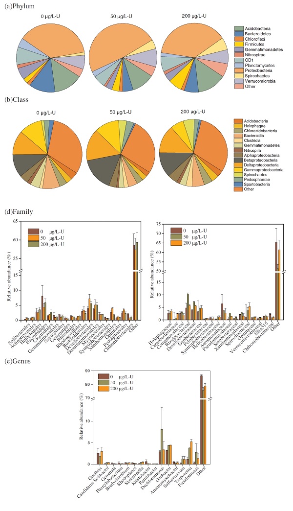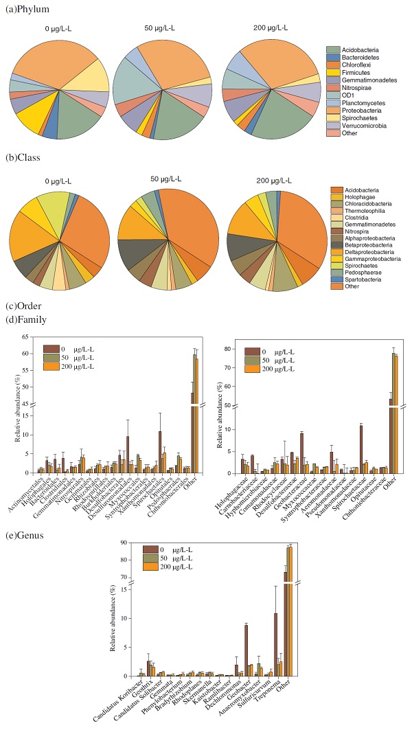 高通量测序结果表明,在不同的AgNPs浓度下,微生物群落变化明显,其中变形菌门、酸杆菌门、拟杆菌门为优势菌。